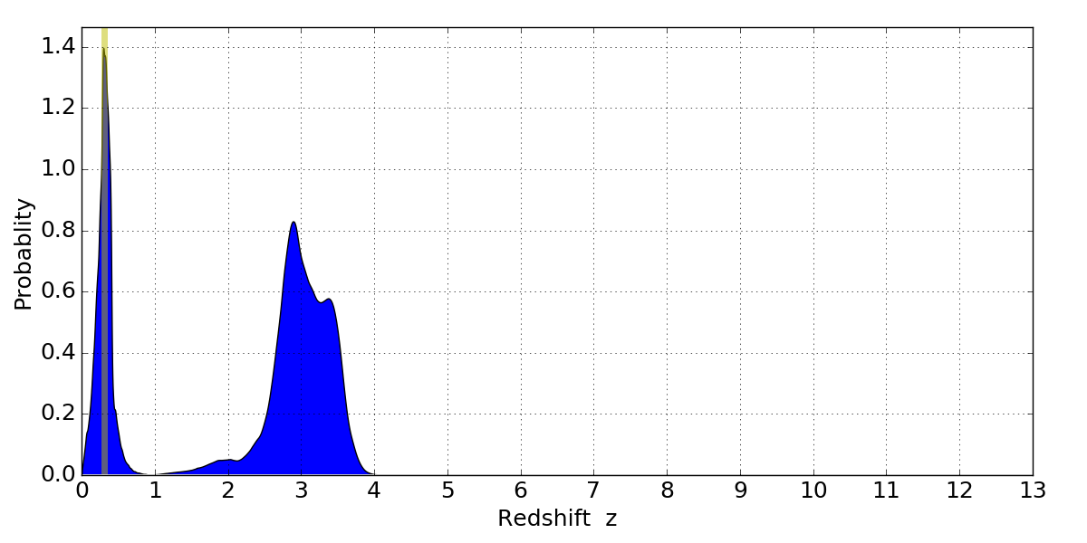 In P(z) plots: Yellow lines mark the cluster redshift z = 0.307,