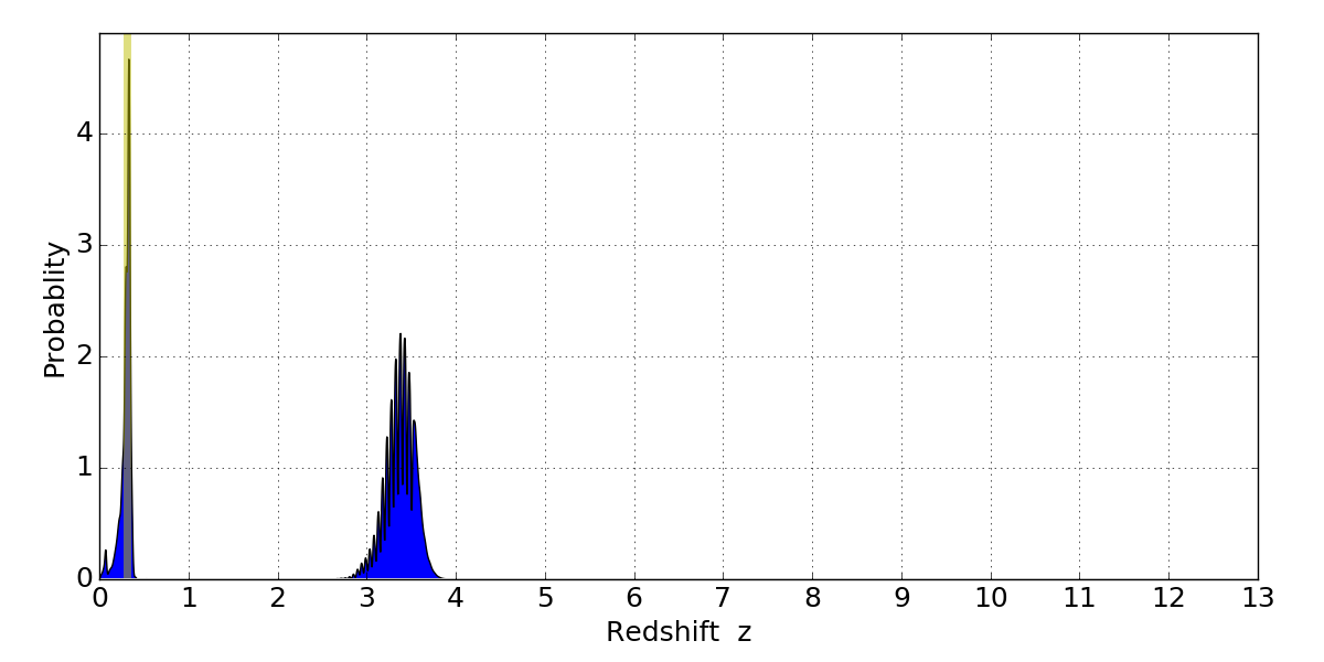 In P(z) plots: Yellow lines mark the cluster redshift z = 0.307,