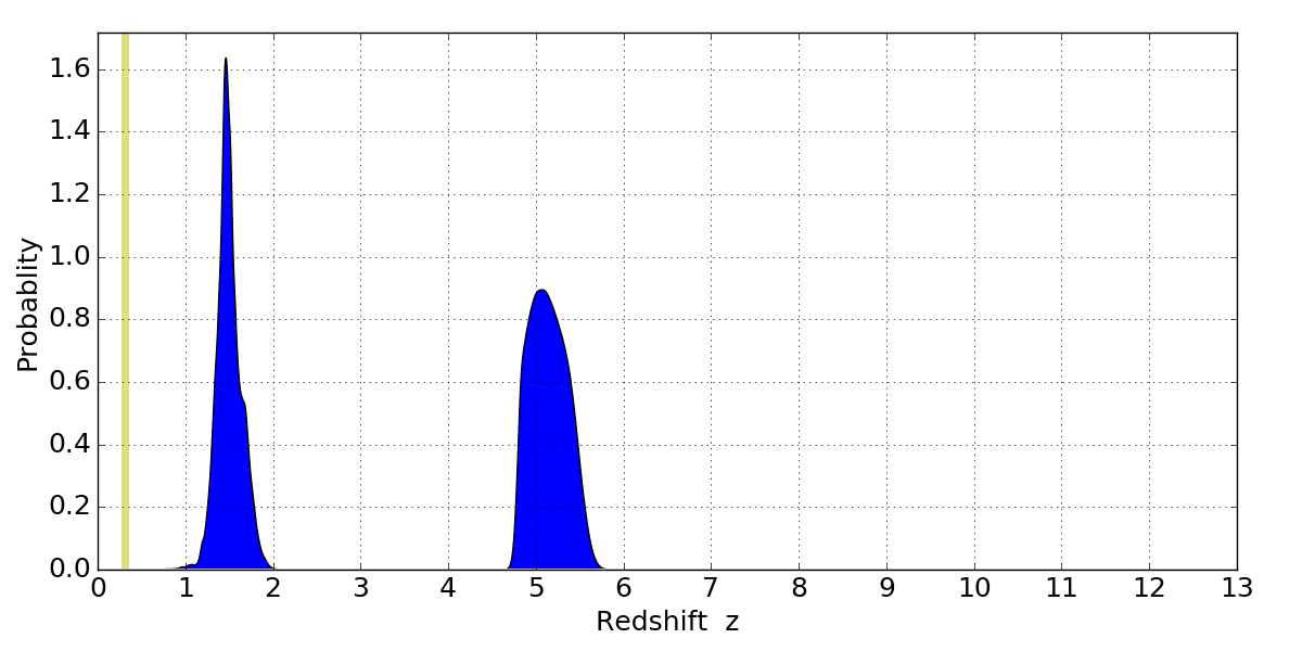 In P(z) plots: Yellow lines mark the cluster redshift z = 0.307,