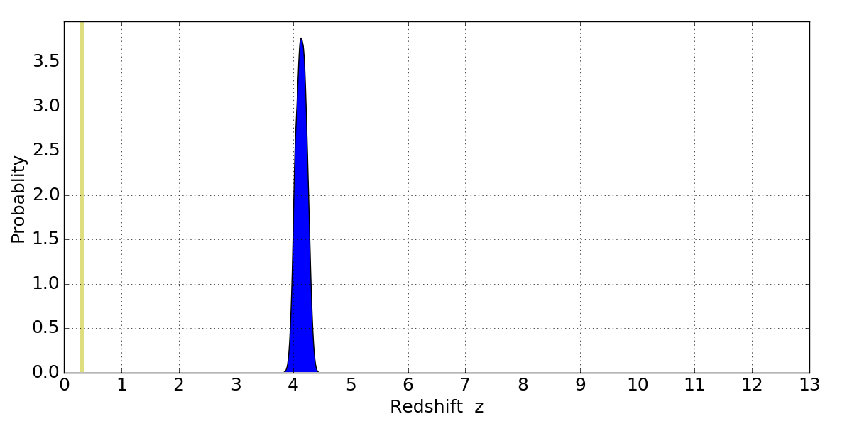 In P(z) plots: Yellow lines mark the cluster redshift z = 0.307,