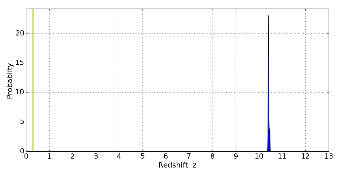 In P(z) plots: Yellow lines mark the cluster redshift z = 0.307,