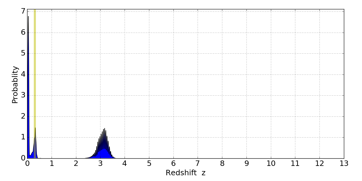 In P(z) plots: Yellow lines mark the cluster redshift z = 0.307,