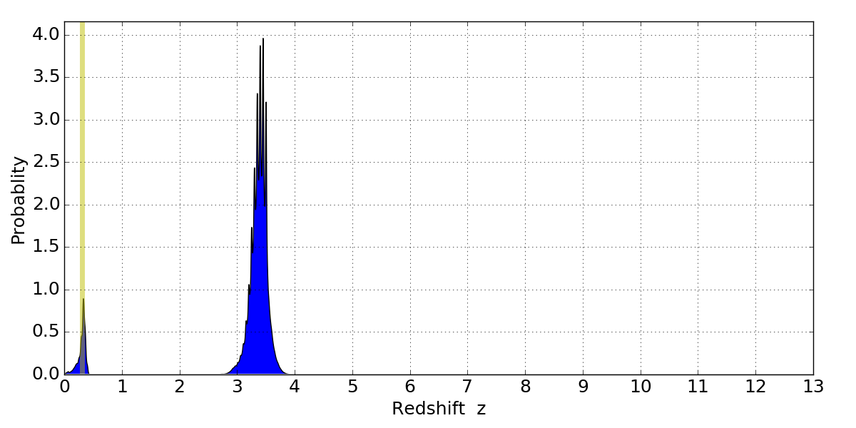 In P(z) plots: Yellow lines mark the cluster redshift z = 0.307,