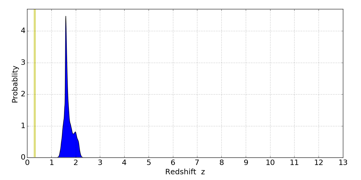 In P(z) plots: Yellow lines mark the cluster redshift z = 0.307,