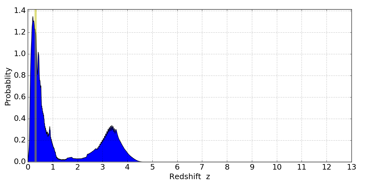 In P(z) plots: Yellow lines mark the cluster redshift z = 0.307,