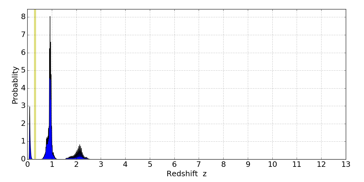In P(z) plots: Yellow lines mark the cluster redshift z = 0.307,