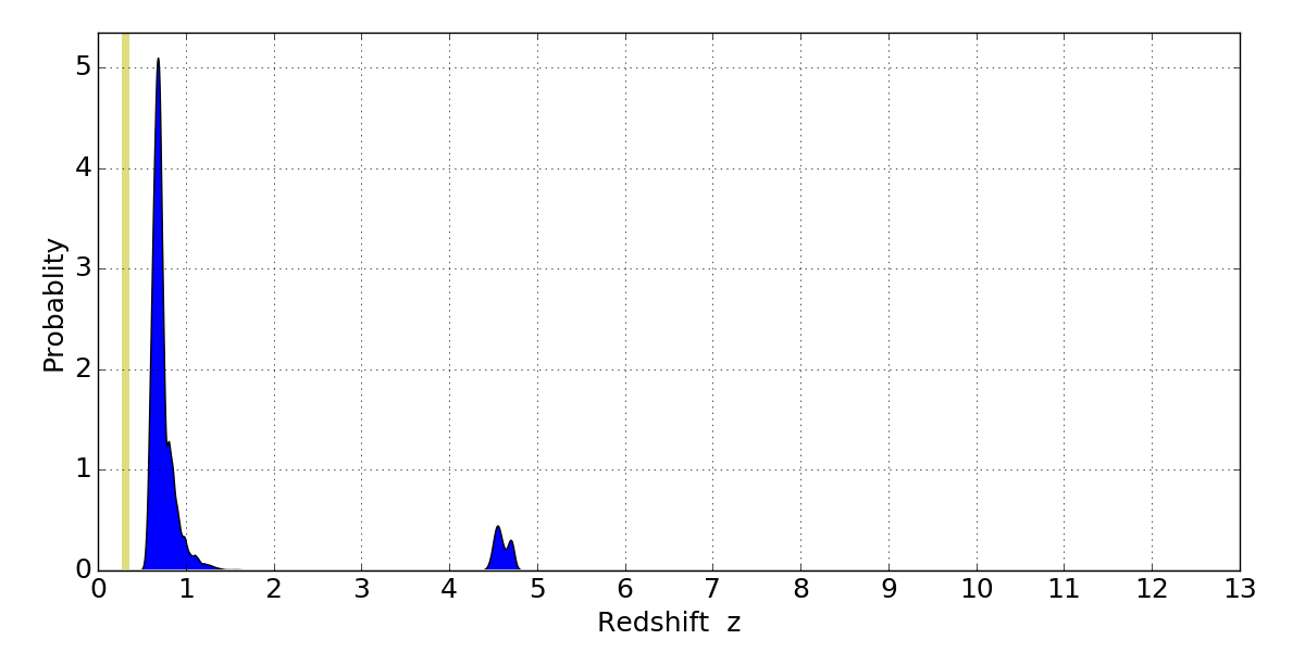 In P(z) plots: Yellow lines mark the cluster redshift z = 0.307,