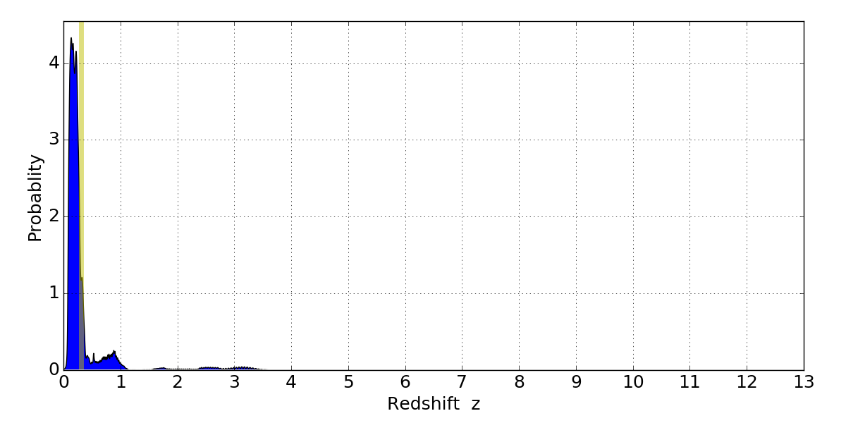 In P(z) plots: Yellow lines mark the cluster redshift z = 0.307,