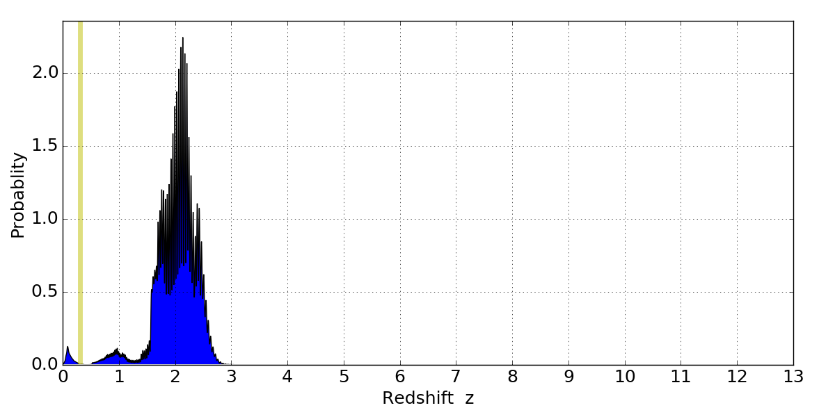 In P(z) plots: Yellow lines mark the cluster redshift z = 0.307,