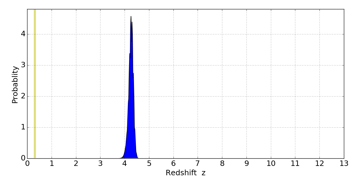 In P(z) plots: Yellow lines mark the cluster redshift z = 0.307,