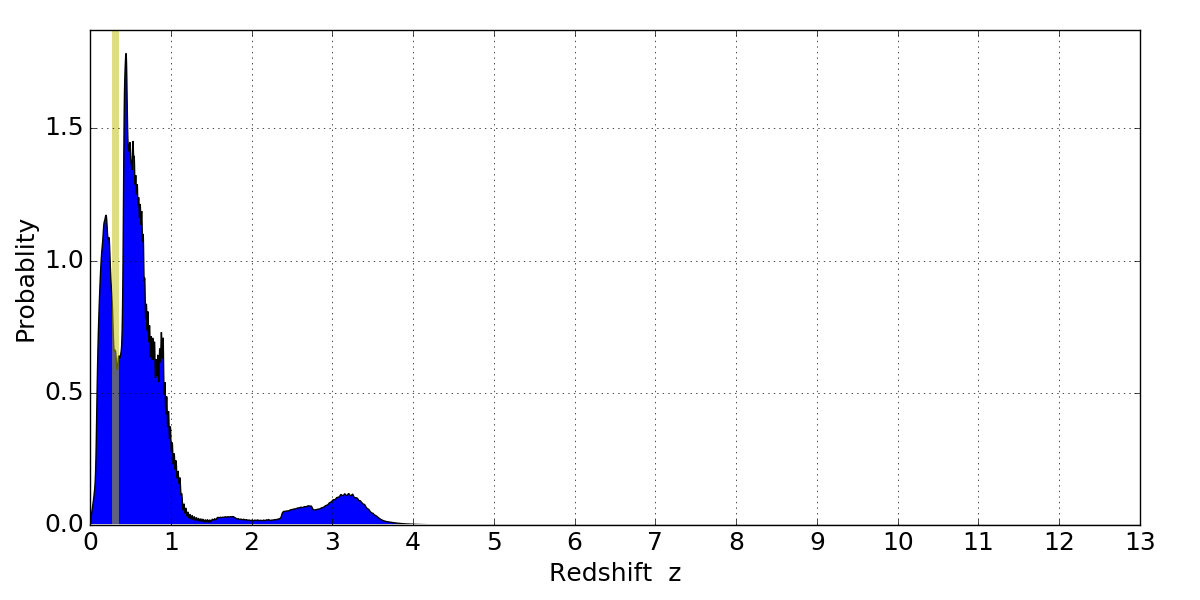 In P(z) plots: Yellow lines mark the cluster redshift z = 0.307,