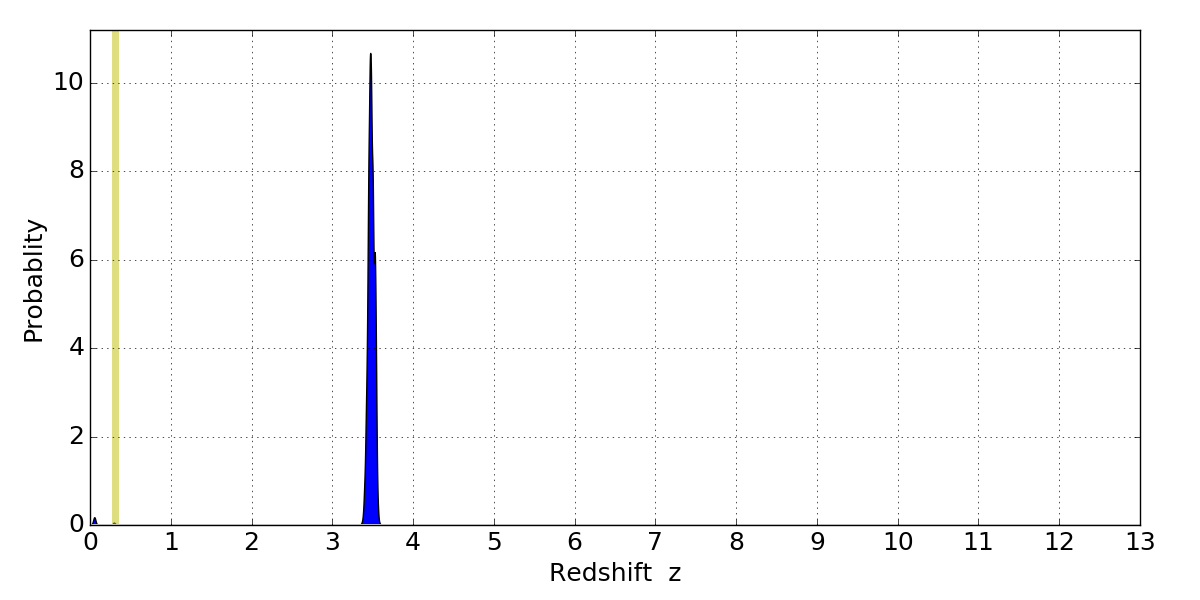 In P(z) plots: Yellow lines mark the cluster redshift z = 0.307,