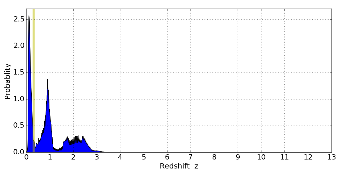 In P(z) plots: Yellow lines mark the cluster redshift z = 0.307,