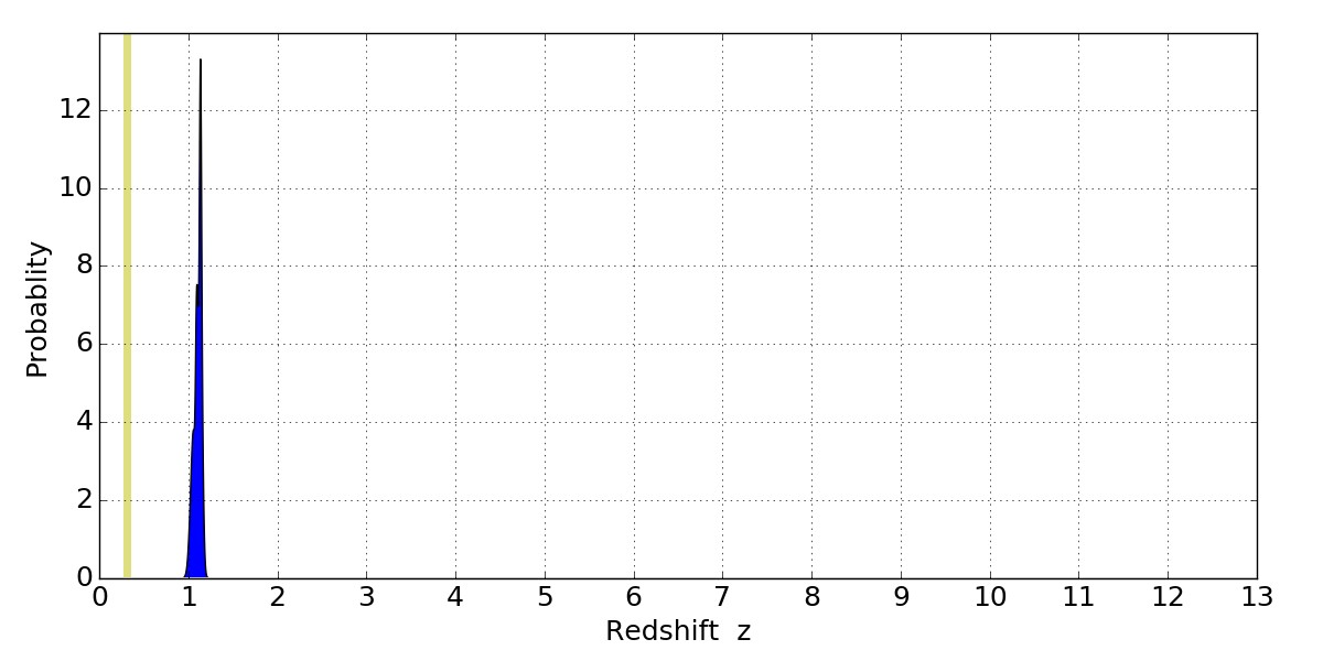 In P(z) plots: Yellow lines mark the cluster redshift z = 0.307,