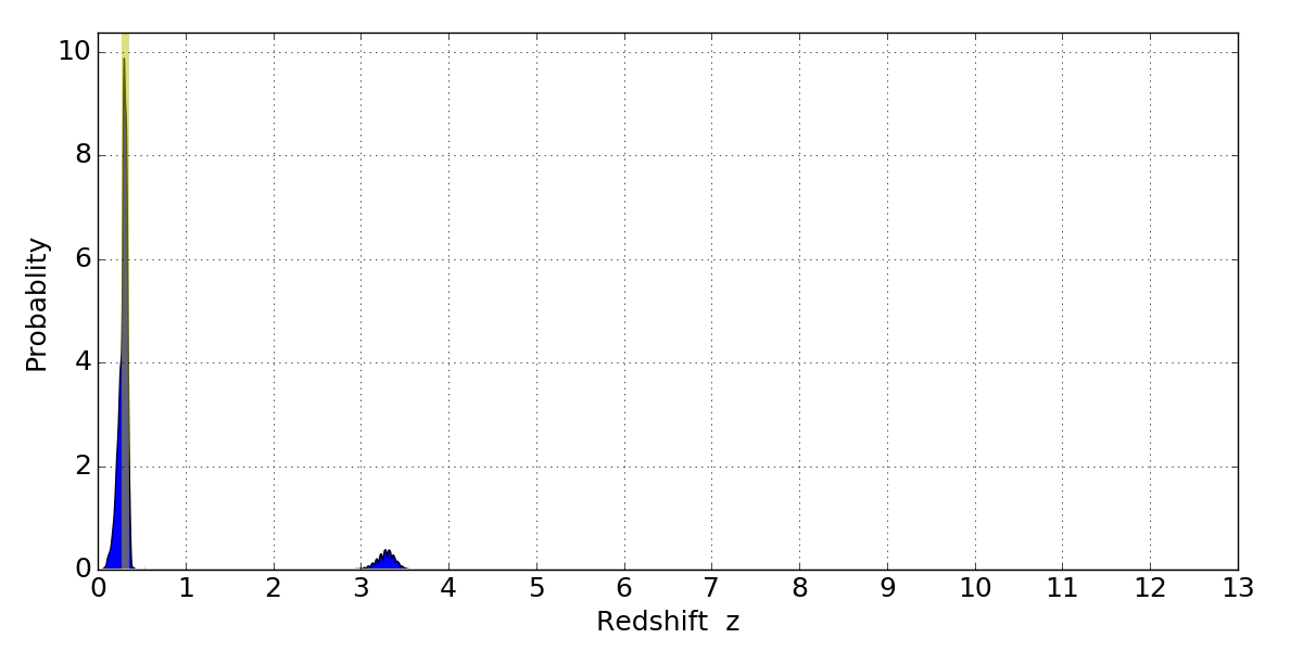 In P(z) plots: Yellow lines mark the cluster redshift z = 0.307,