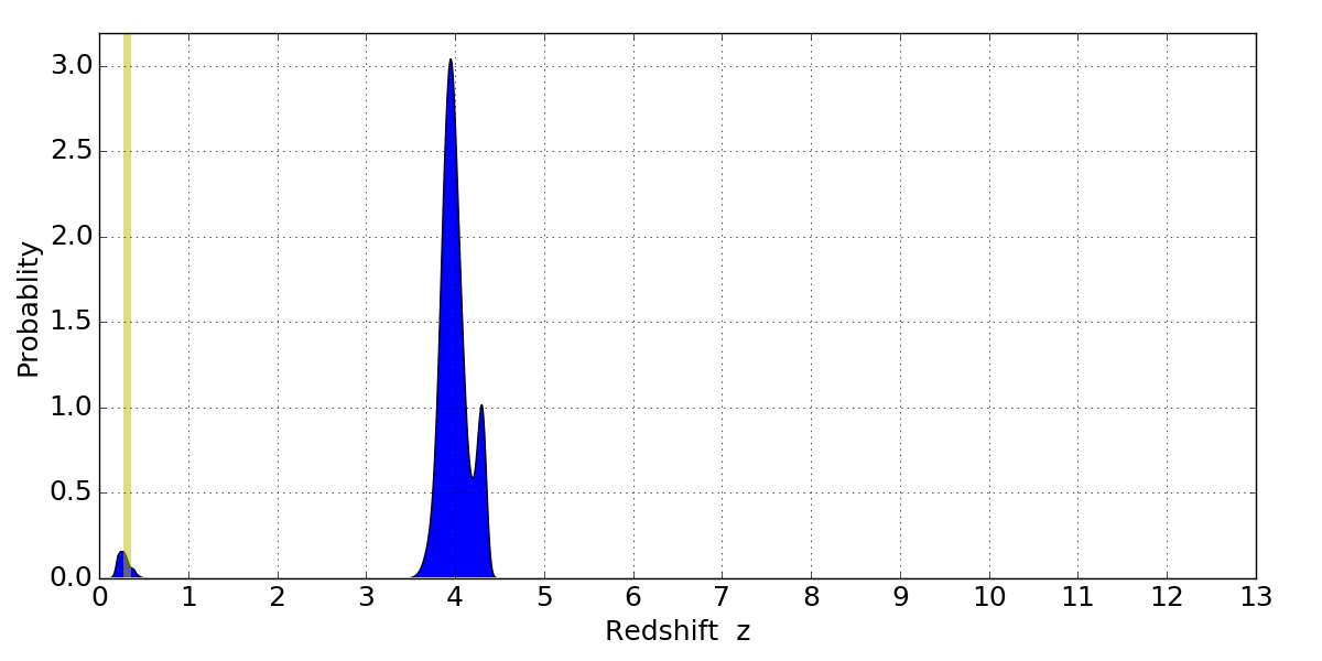 In P(z) plots: Yellow lines mark the cluster redshift z = 0.307,