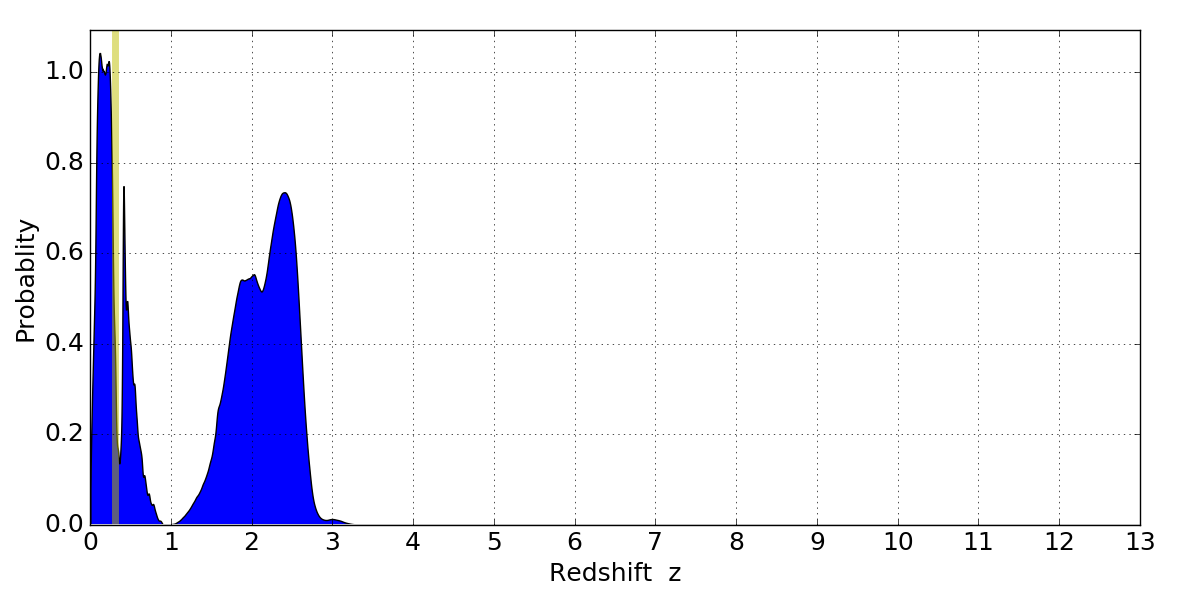 In P(z) plots: Yellow lines mark the cluster redshift z = 0.307,