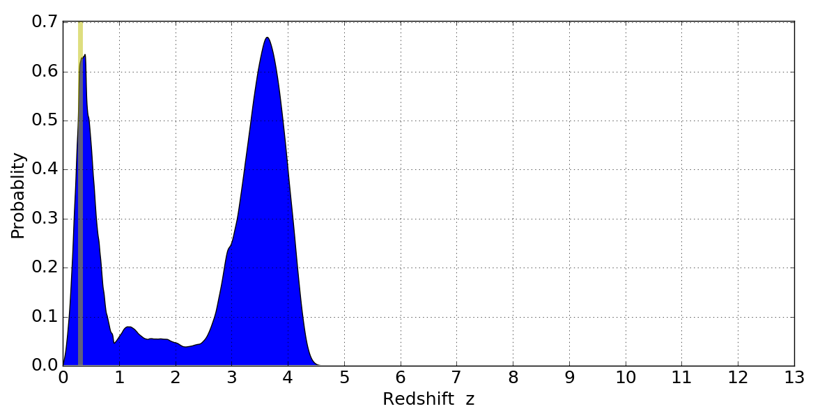 In P(z) plots: Yellow lines mark the cluster redshift z = 0.307,
