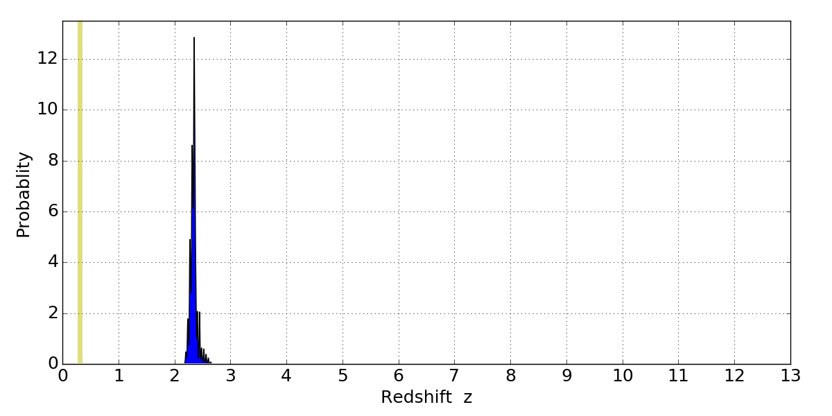 In P(z) plots: Yellow lines mark the cluster redshift z = 0.307,