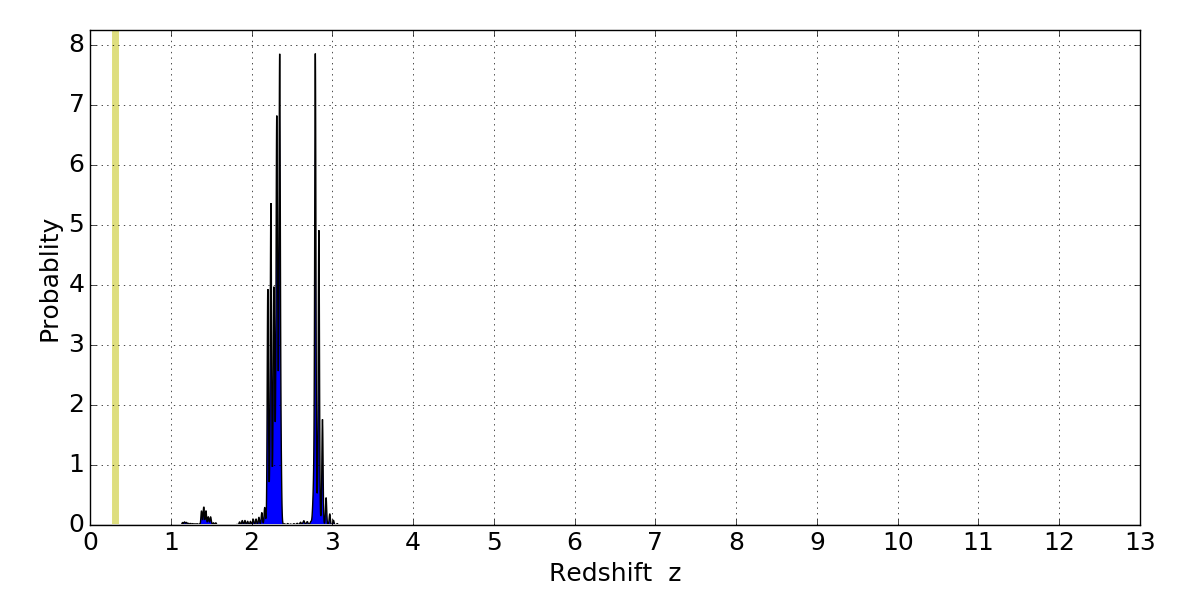In P(z) plots: Yellow lines mark the cluster redshift z = 0.307,
