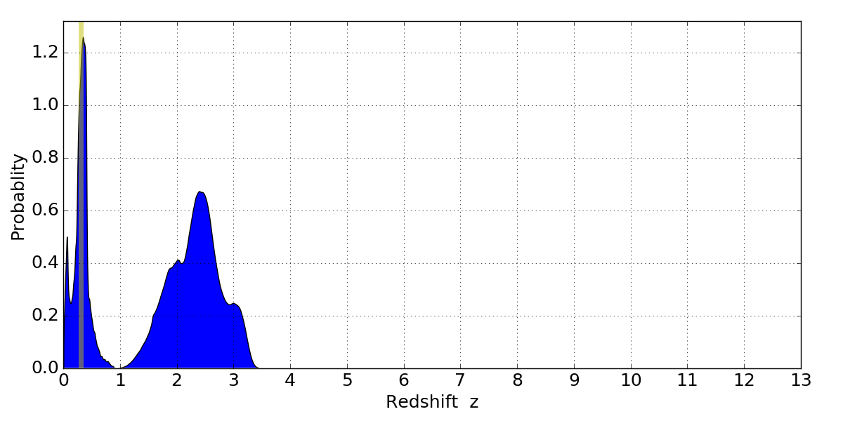 In P(z) plots: Yellow lines mark the cluster redshift z = 0.307,