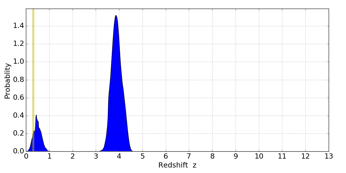 In P(z) plots: Yellow lines mark the cluster redshift z = 0.307,