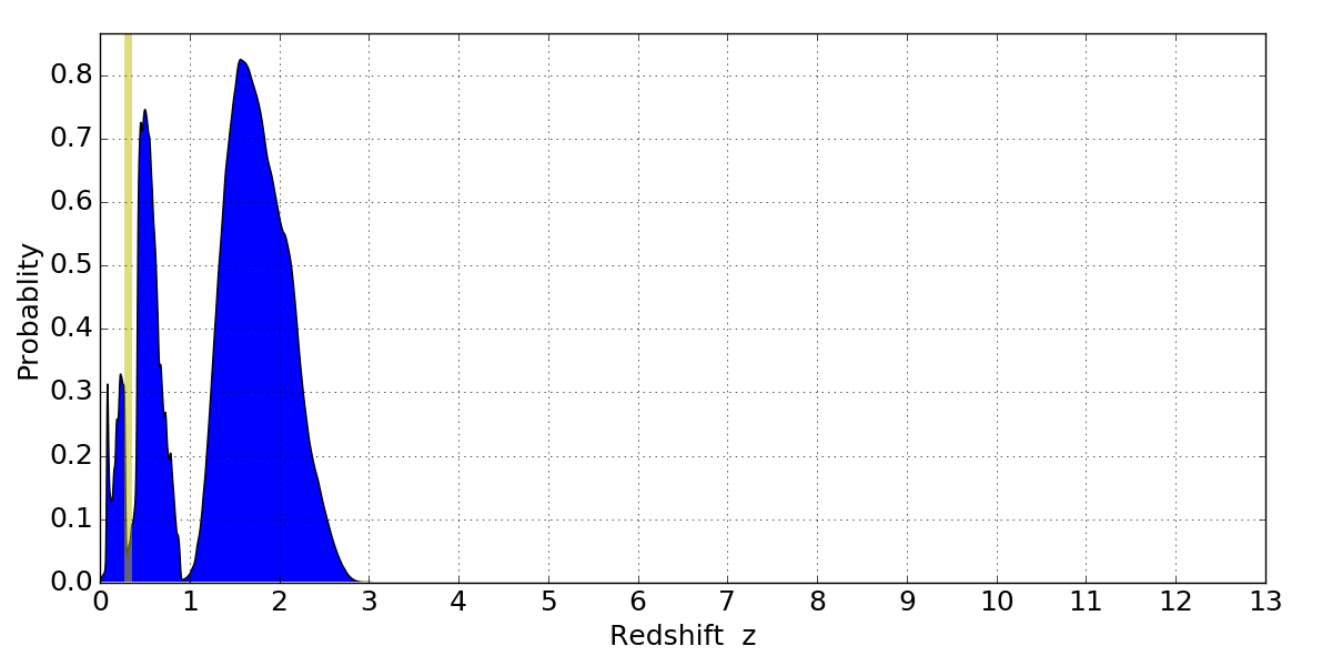 In P(z) plots: Yellow lines mark the cluster redshift z = 0.307,