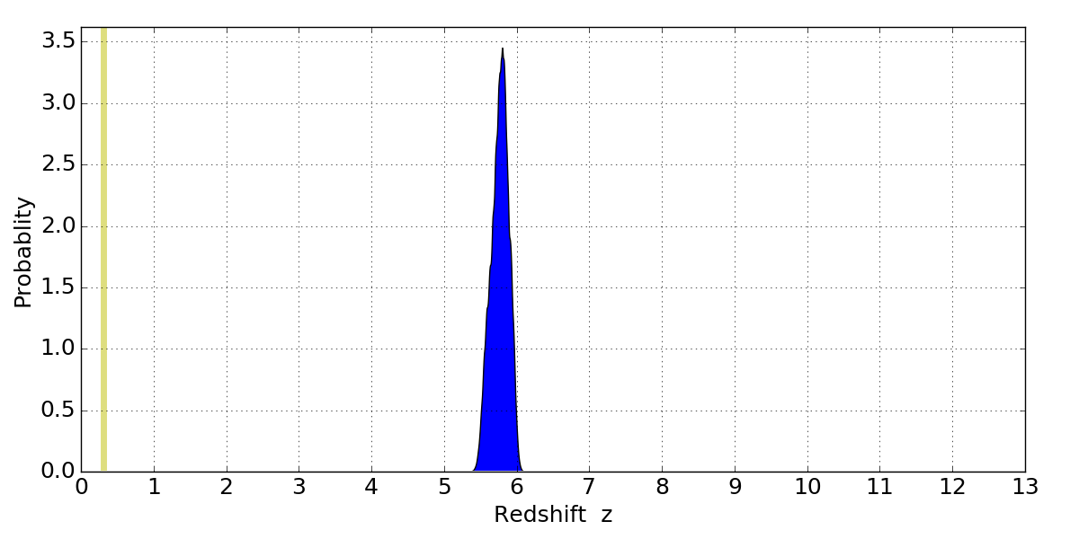 In P(z) plots: Yellow lines mark the cluster redshift z = 0.307,