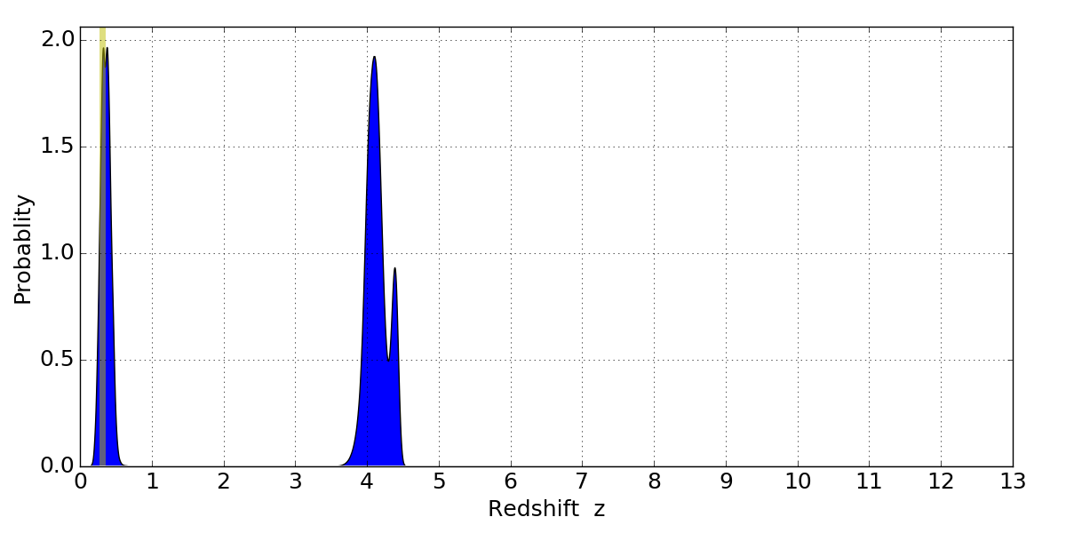 In P(z) plots: Yellow lines mark the cluster redshift z = 0.307,
