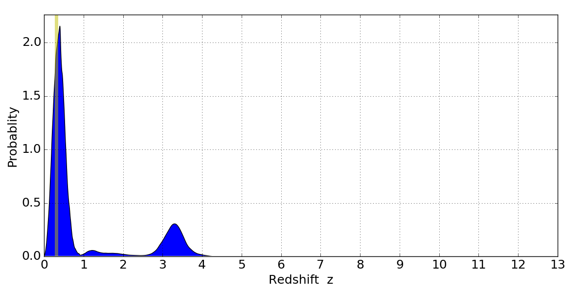 In P(z) plots: Yellow lines mark the cluster redshift z = 0.307,