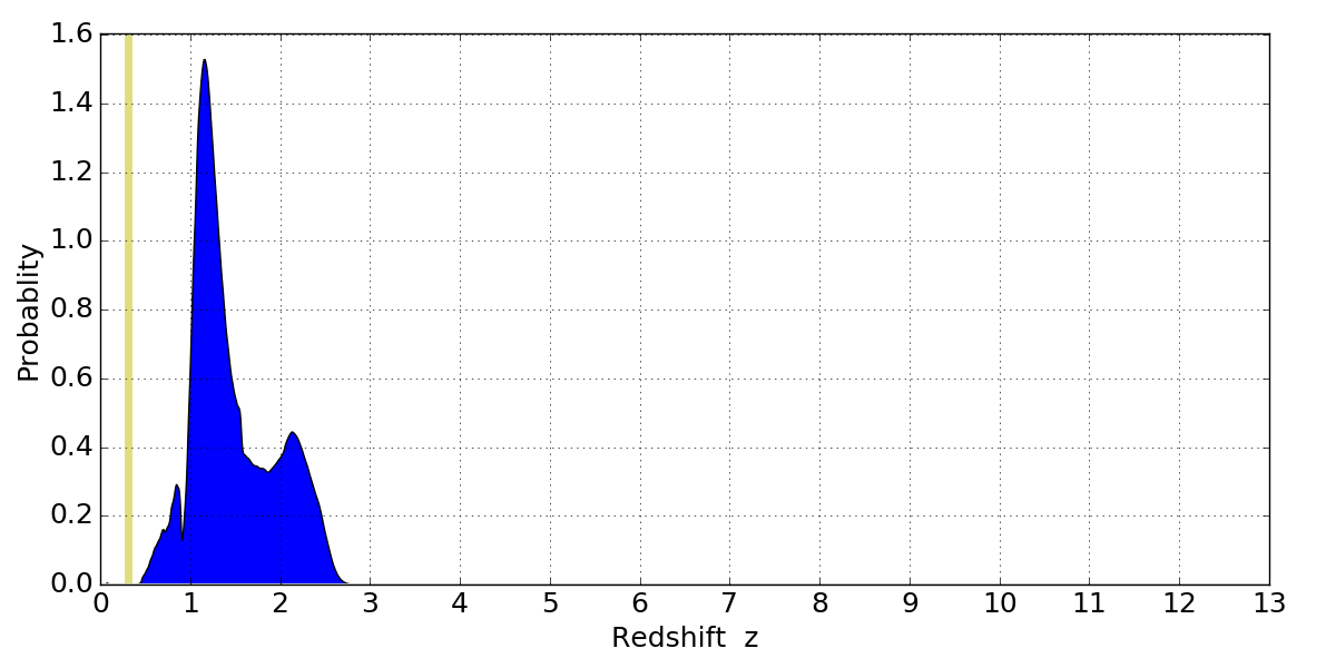 In P(z) plots: Yellow lines mark the cluster redshift z = 0.307,