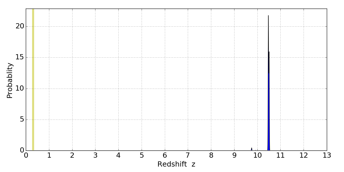 In P(z) plots: Yellow lines mark the cluster redshift z = 0.307,