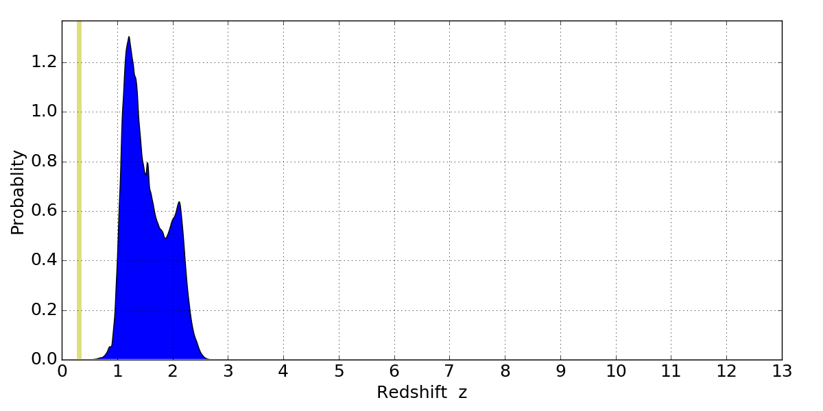 In P(z) plots: Yellow lines mark the cluster redshift z = 0.307,