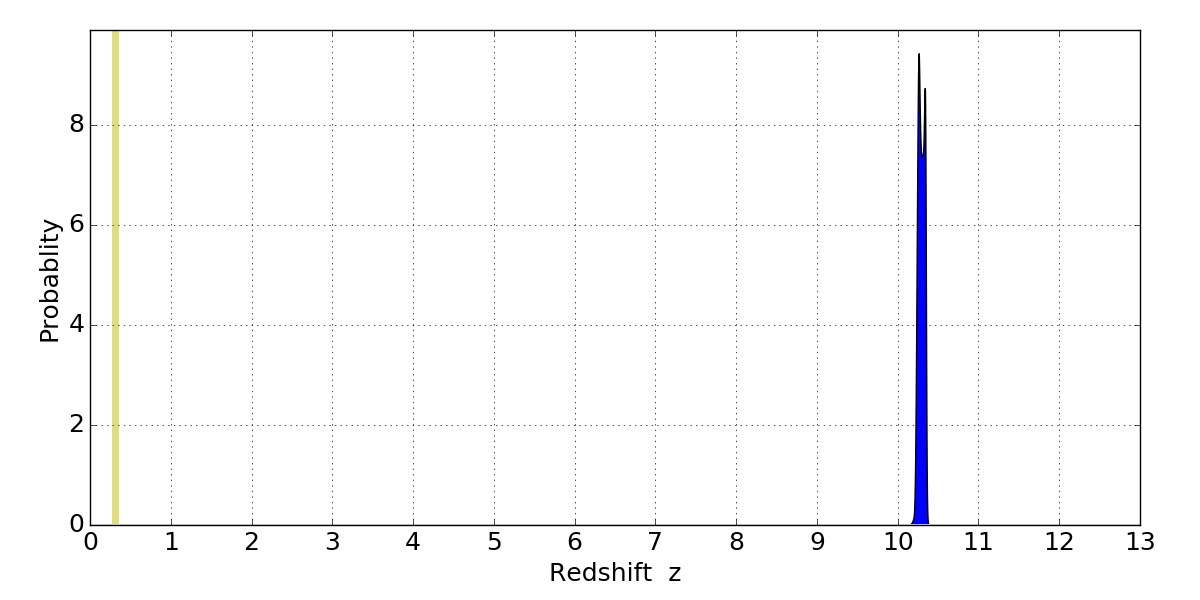 In P(z) plots: Yellow lines mark the cluster redshift z = 0.307,
