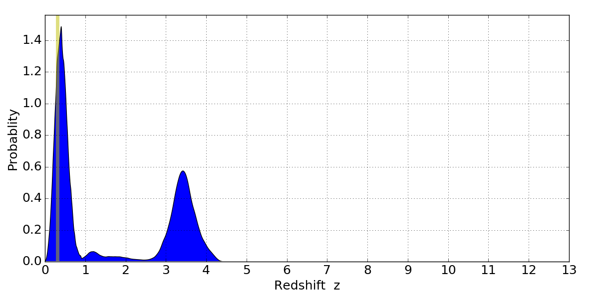 In P(z) plots: Yellow lines mark the cluster redshift z = 0.307,