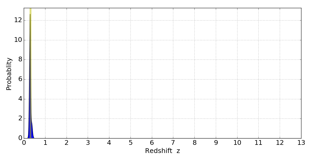 In P(z) plots: Yellow lines mark the cluster redshift z = 0.307,