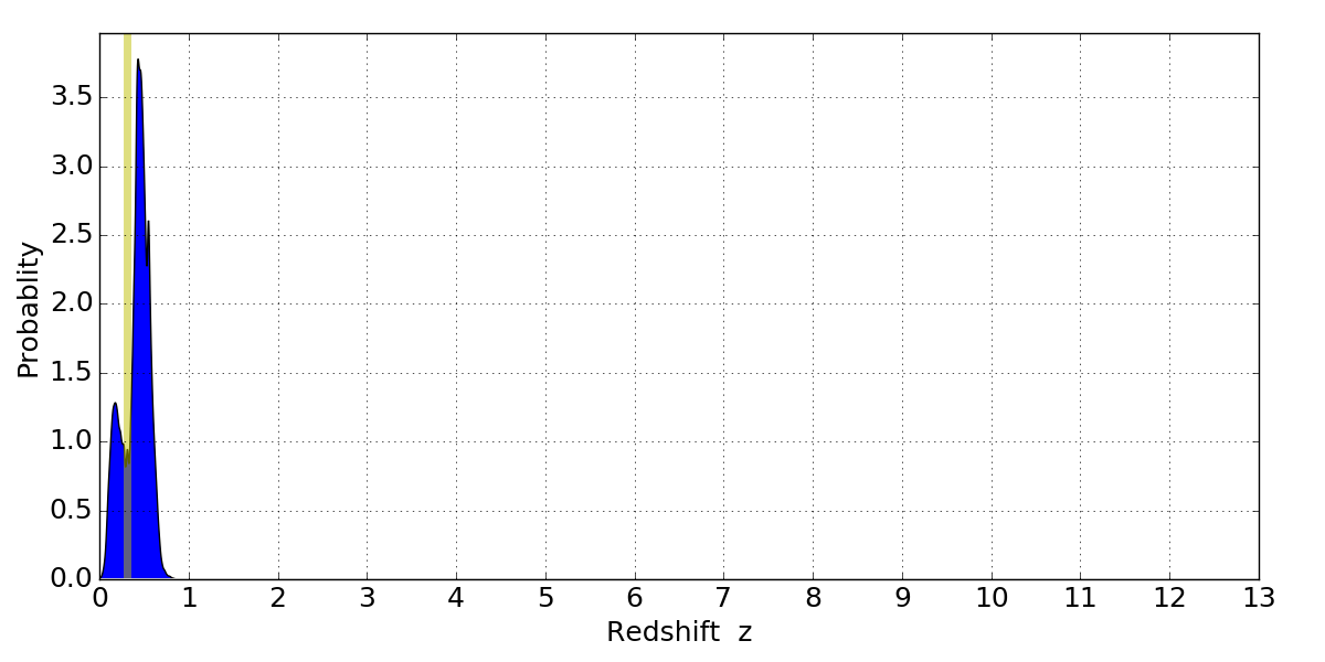 In P(z) plots: Yellow lines mark the cluster redshift z = 0.307,