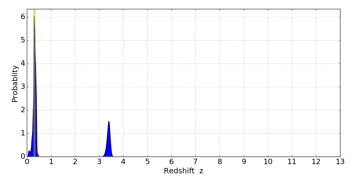 In P(z) plots: Yellow lines mark the cluster redshift z = 0.307,
