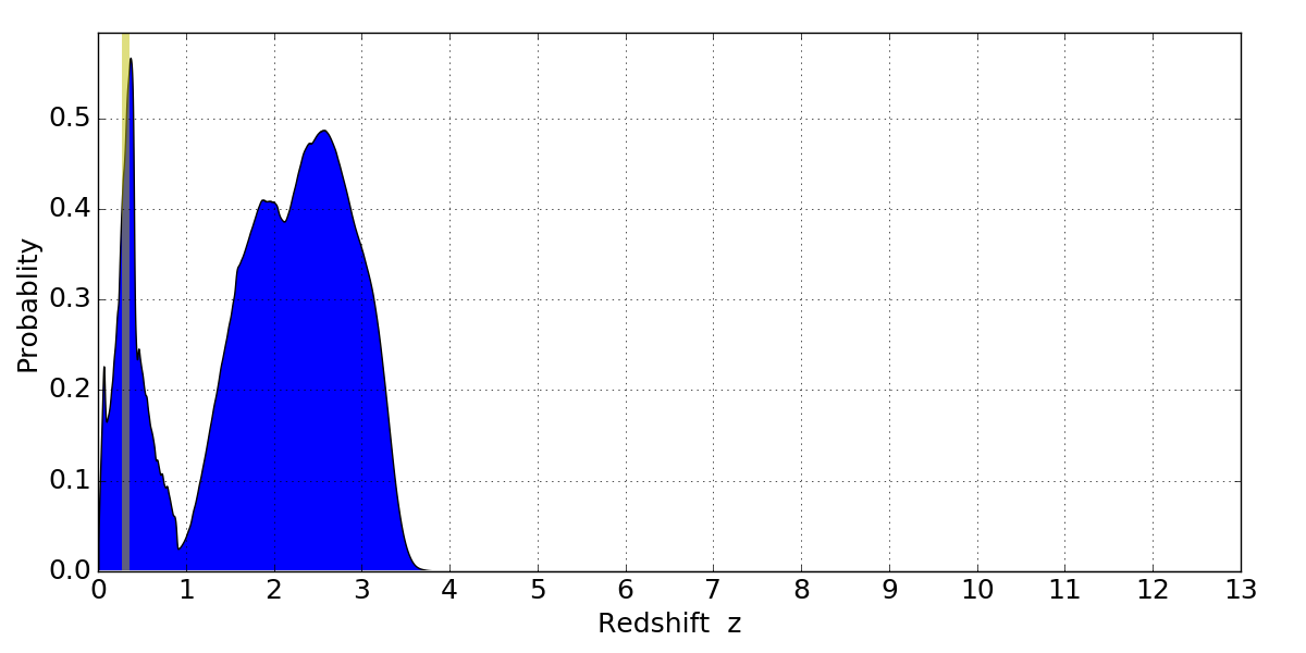In P(z) plots: Yellow lines mark the cluster redshift z = 0.307,