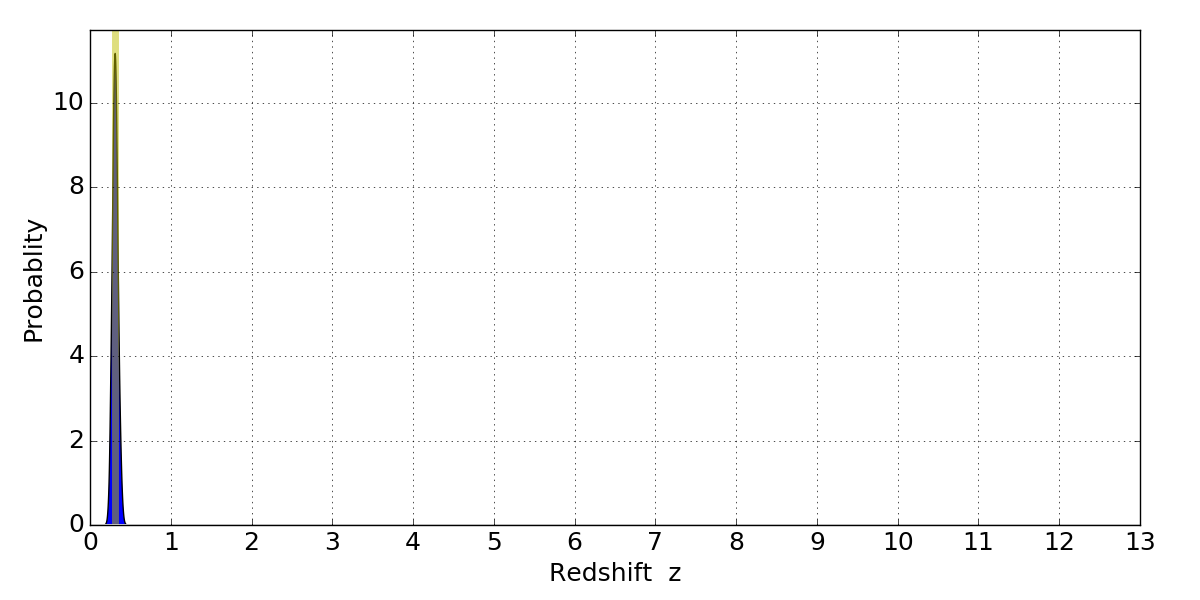 In P(z) plots: Yellow lines mark the cluster redshift z = 0.307,