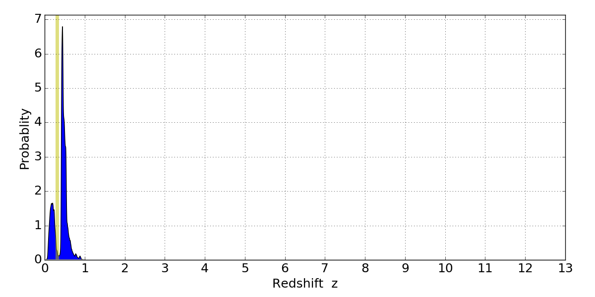 In P(z) plots: Yellow lines mark the cluster redshift z = 0.307,