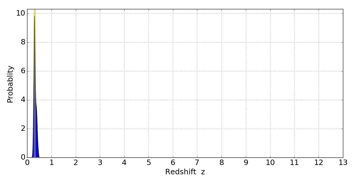 In P(z) plots: Yellow lines mark the cluster redshift z = 0.307,