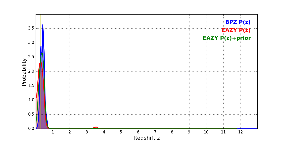 In P(z) plots: Yellow lines mark the cluster redshift z = 0.307,