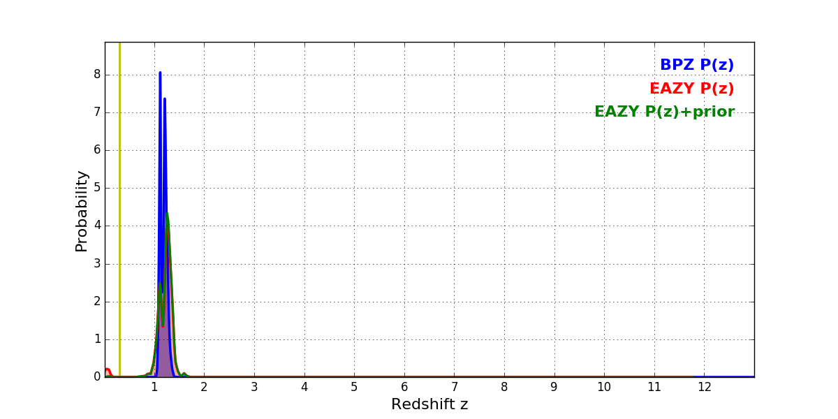 In P(z) plots: Yellow lines mark the cluster redshift z = 0.307,