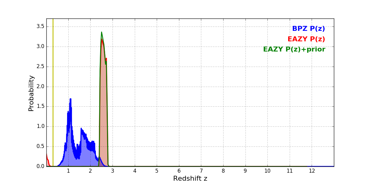 In P(z) plots: Yellow lines mark the cluster redshift z = 0.307,