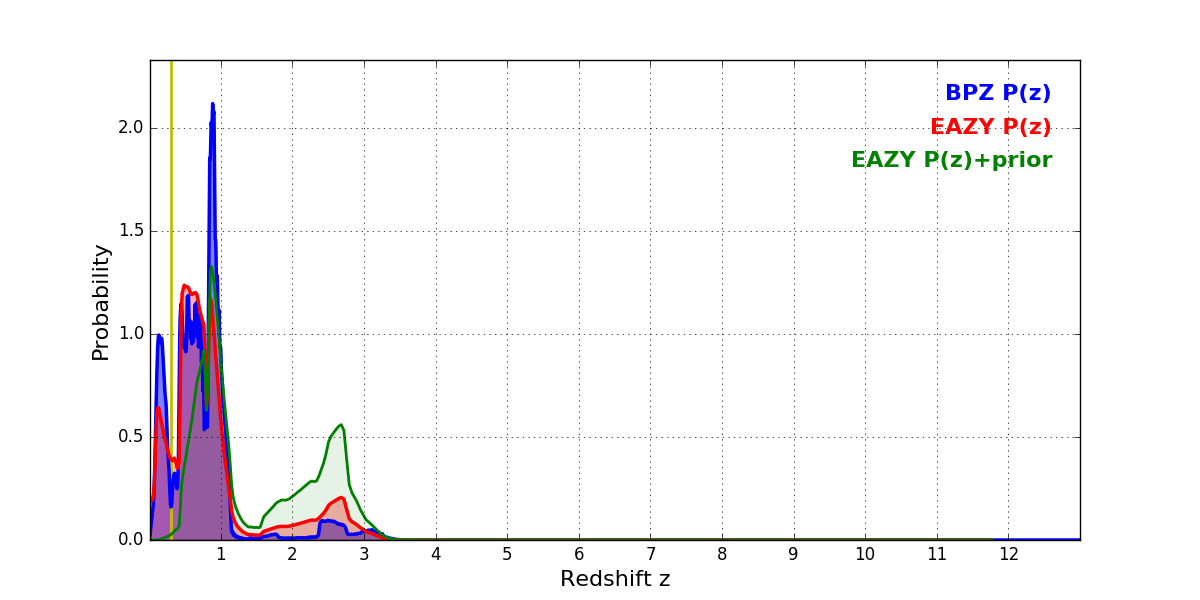 In P(z) plots: Yellow lines mark the cluster redshift z = 0.307,