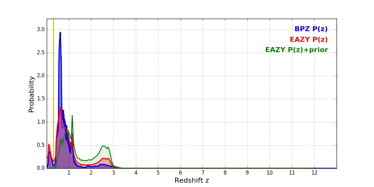 In P(z) plots: Yellow lines mark the cluster redshift z = 0.307,