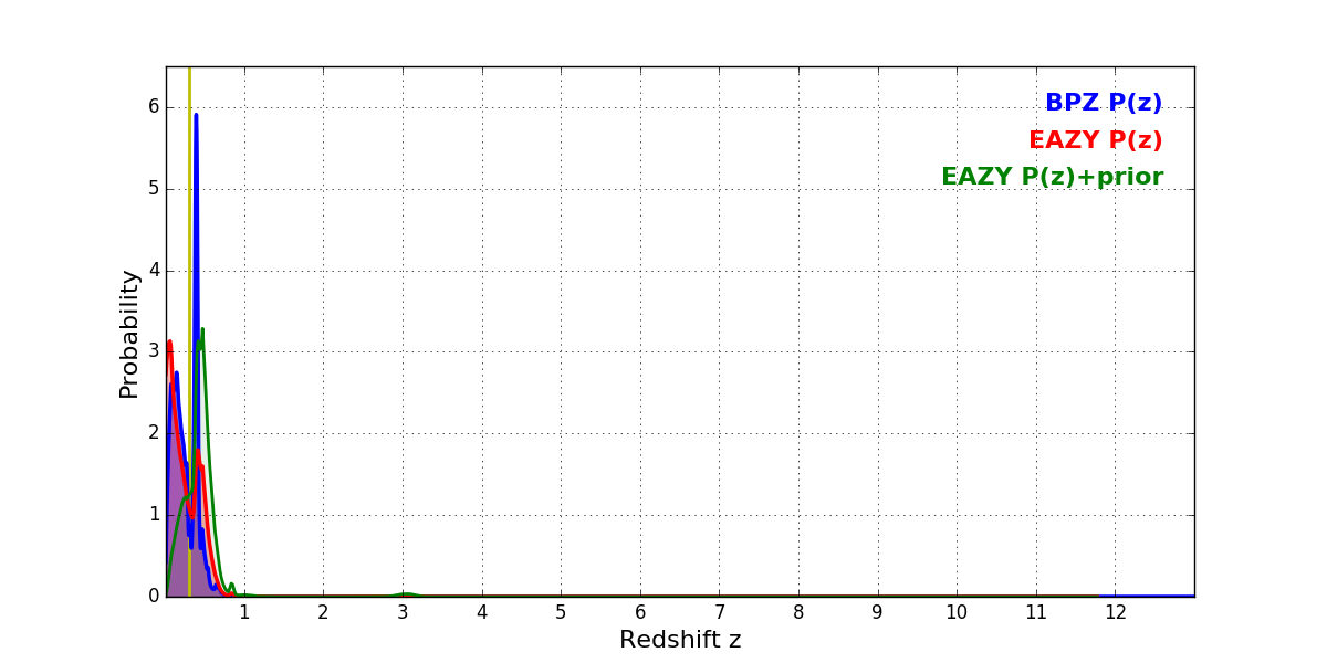 In P(z) plots: Yellow lines mark the cluster redshift z = 0.307,