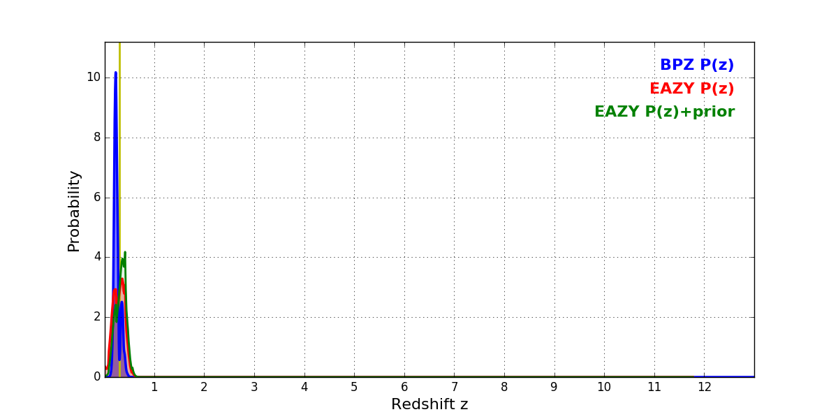 In P(z) plots: Yellow lines mark the cluster redshift z = 0.307,