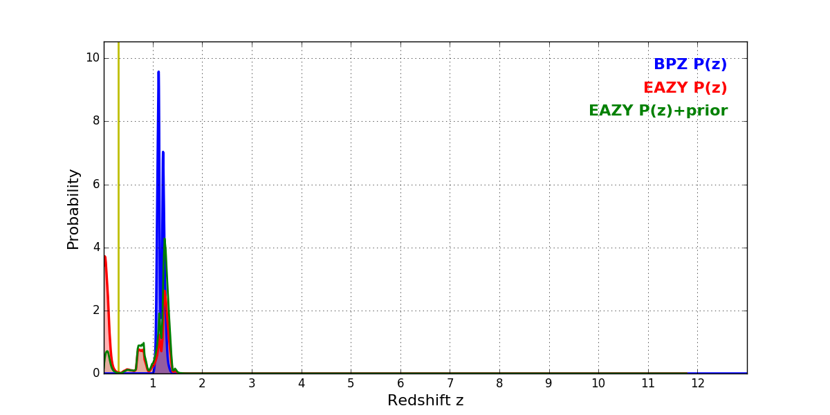 In P(z) plots: Yellow lines mark the cluster redshift z = 0.307,